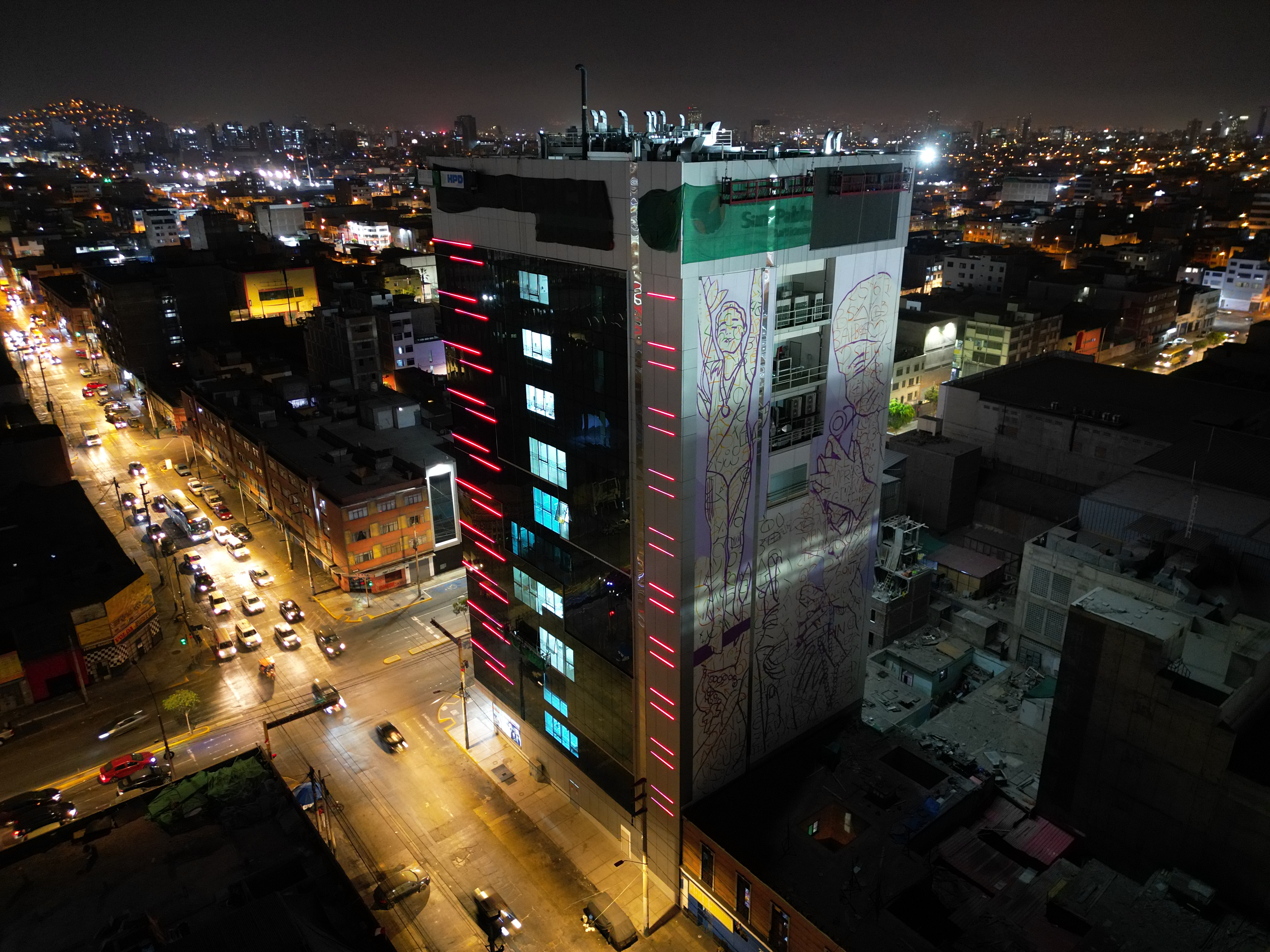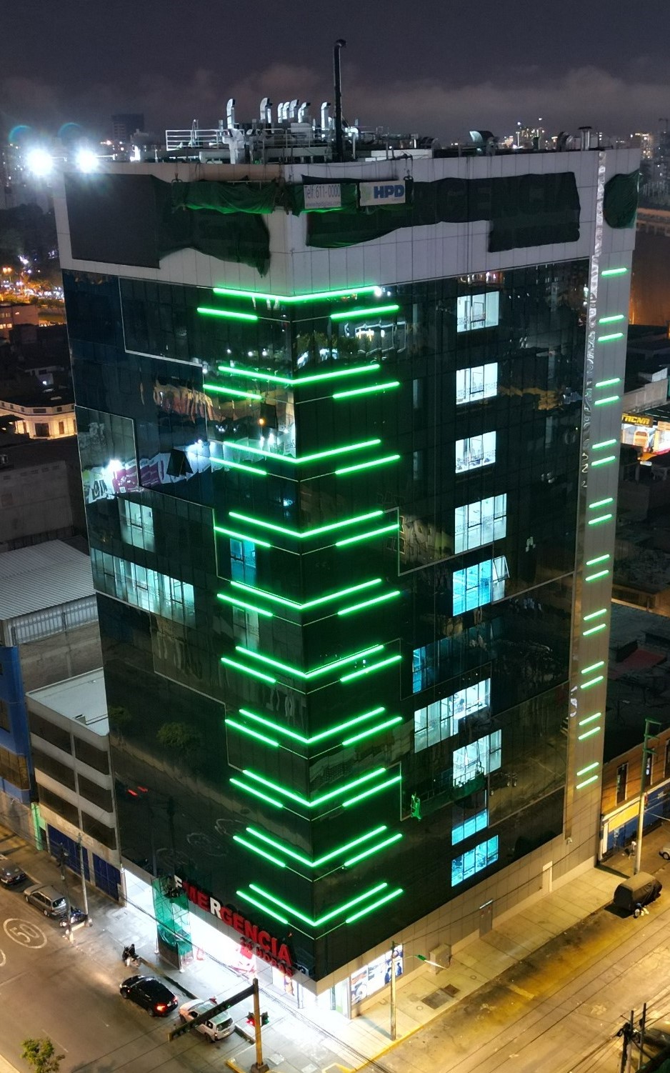 Edificio de un sótano, seis pisos y azotea, estacionamientos, pórtico de ingreso y áreas de jardines (paisajismo).